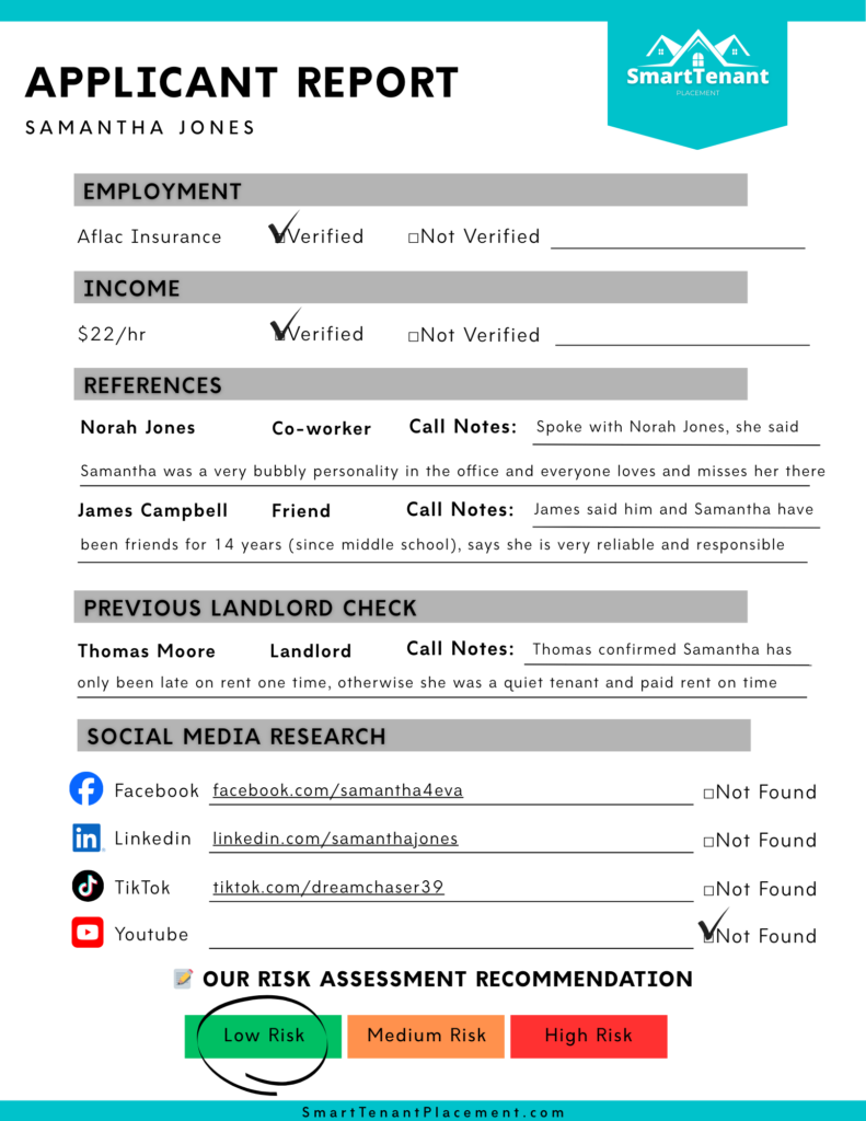 This is for one Tenant Screening Report. After payment you will need to email us the file or photo of your tenant application. If you need multiple Tenant Screening Reports simply adjust the quantity of your order, then email the applications directly to us at: info@smarttenantplacement.com – If you need assistance please feel free to email us at anytime! We verify employment, call references, call previous landlord(s), dig through social media, give our risk assessment and more. The preview of our Applicant Report is basic and thorough… if we find more information we will attach it to your main Applicant Report.